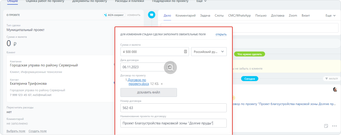 Прикрепление в карточку проекта списка подрядчиков по проекту. Позволяет работать с карточкой подрядчика напрямую из проекта.