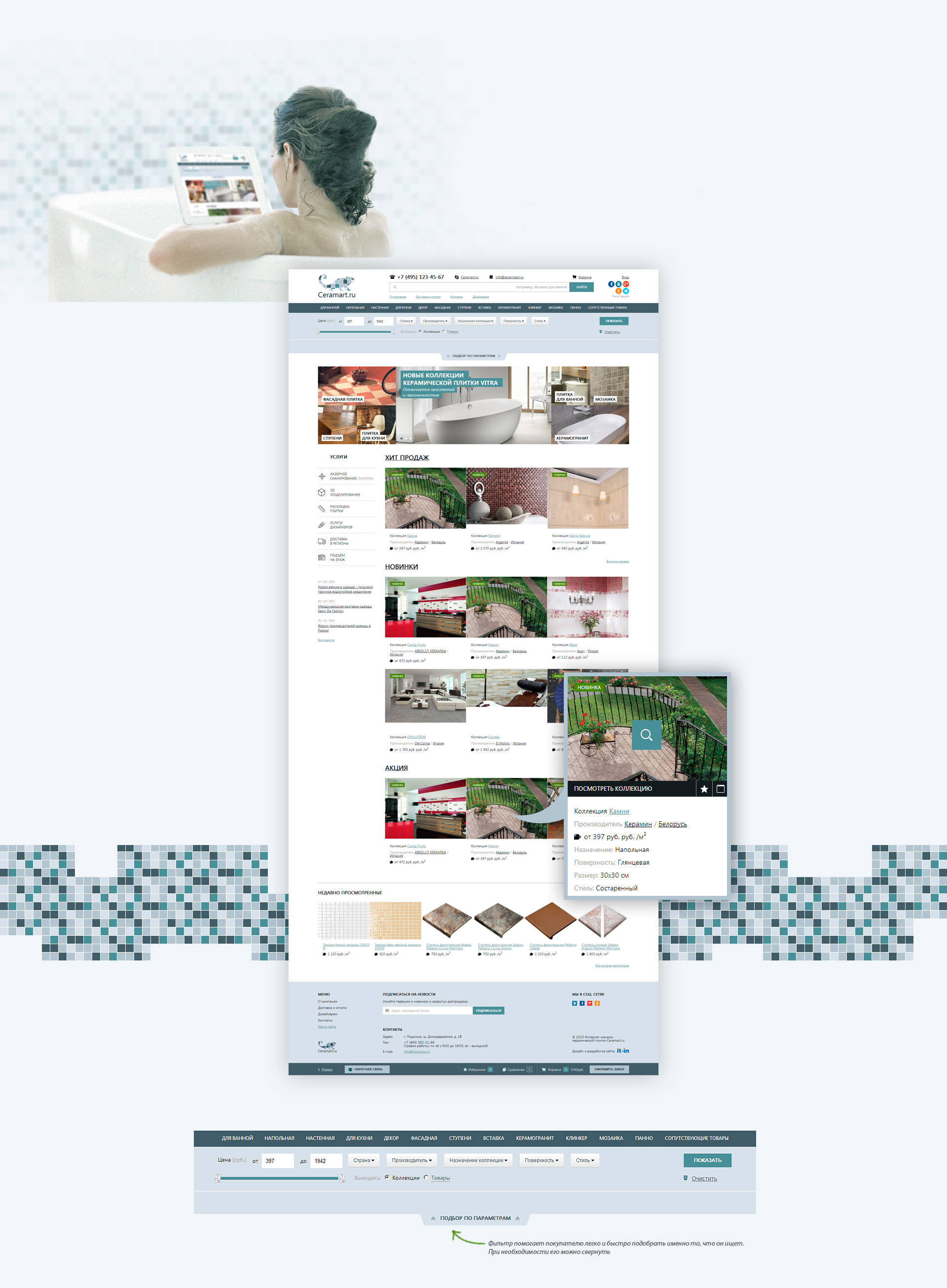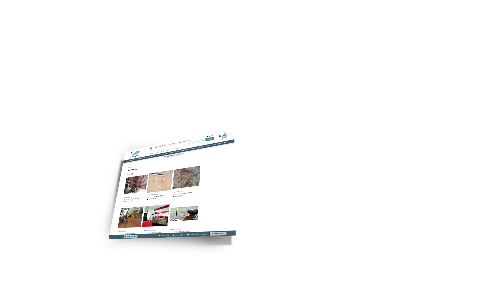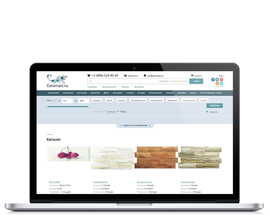 Все товары разделены на коллекции. В каждой коллекции представлены разные виды плитки. Фильтр позволяет выбрать отображение на одной странице по коллекциям или по товарам.